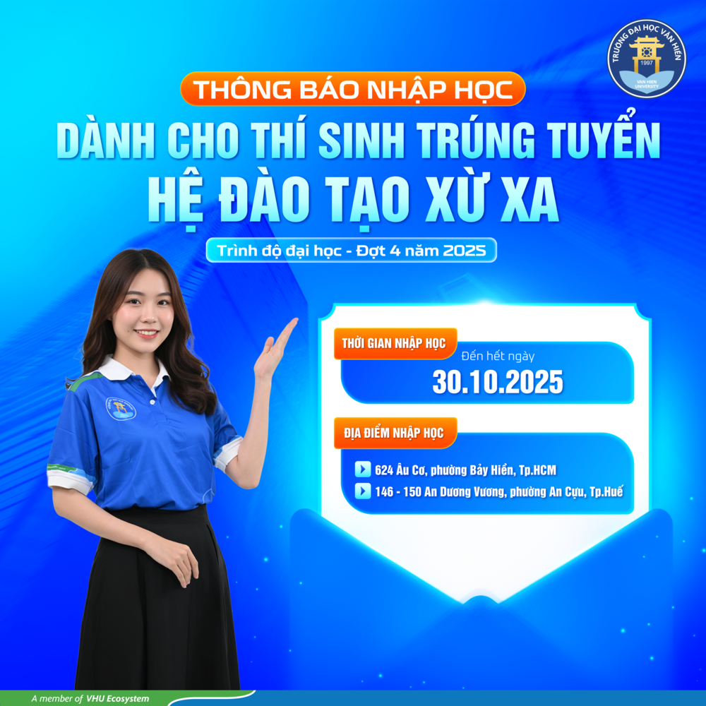 Trường Đại học Văn Hiến thông báo điểm trúng tuyển và thông tin nhập học đối với thí sinh trúng tuyển đào tạo từ xa trình độ Đại học đợt 4 năm 2025.