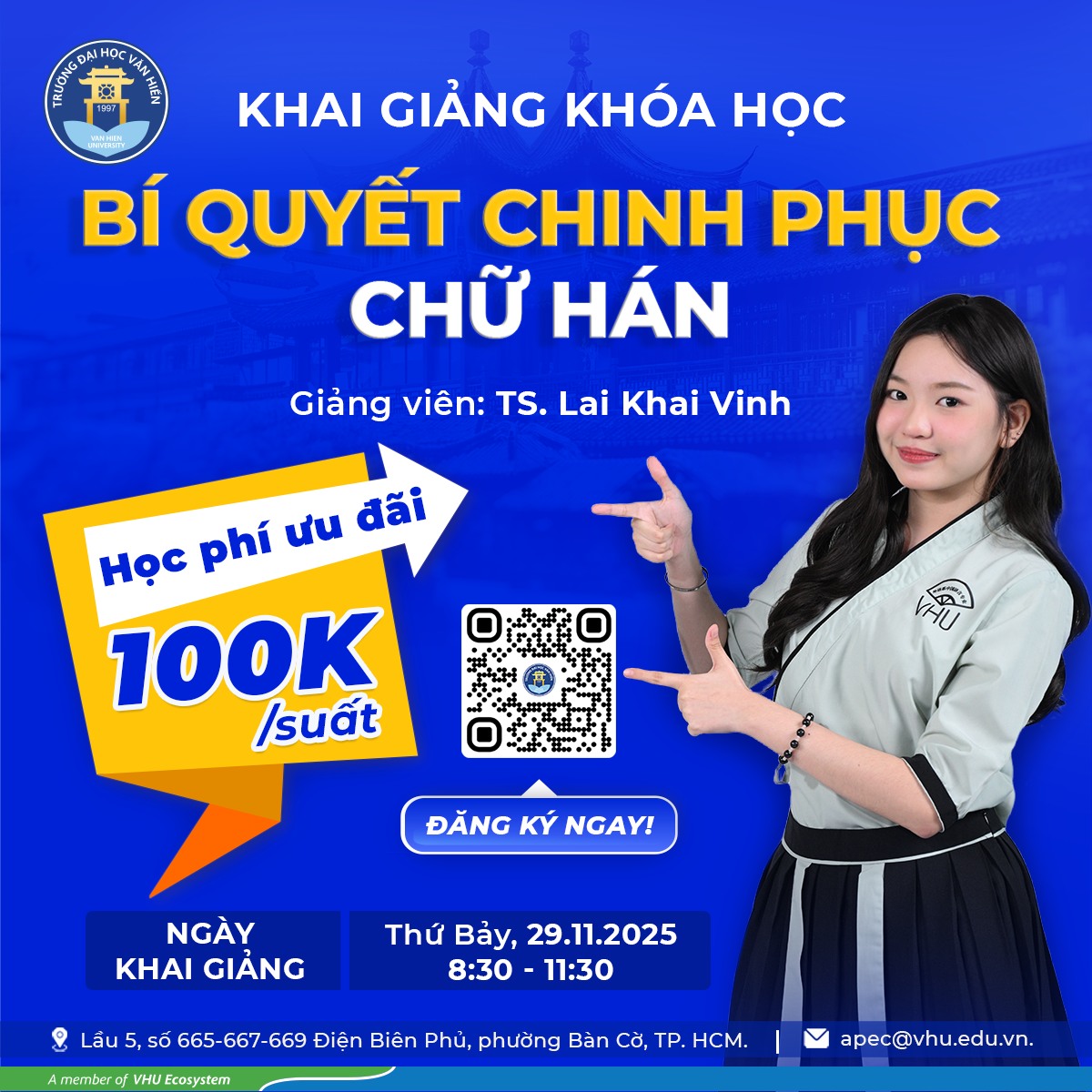 Nhằm lan tỏa giá trị văn hóa Á Đông và mở rộng hiểu biết của sinh viên về ngôn ngữ Hán học một cách sáng tạo, Viện Chuyển giao Kết nối APEC - Trường Đại học Văn Hiến tổ chức khóa đào tạo ngắn hạn: “BÍ QUYẾT CHINH PHỤC CHỮ HÁN” do Tiến sĩ Lai Khai Vinh, Phó Trưởng khoa Ngoại ngữ, trực tiếp giảng dạy.